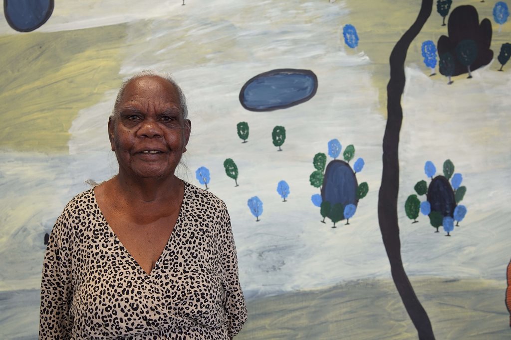 Nancy Yukuwal McDinny was born in 1958 among the mangroves near Milrila on Fetrel Island, between Manangoora Station and Vanderlin Island in the Gulf of Carpentaria. A Nangalama skin name bearer of the Mambaliya clan-Wawukarriya, McDinny’s work embodies her deep cultural heritage, as her practice is rooted in her Kurdarrku (Brolga) dreaming, and her connection to Wubunjawa country near Marrinybul. With dual heritage – Garrwa through her father (Dinny McDinny), and Yanyuwa through her mother – McDinny’s paintings translate knowledge passed down from her respected elders known as Warlaba. Her works invite viewers into a deeper understanding of Indigenous Australian connection to country, as they embody relationships between land, laws, and ceremony.